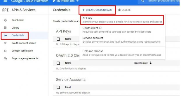 13. Click on Credentials and click on +Create Credentials and click on API key.