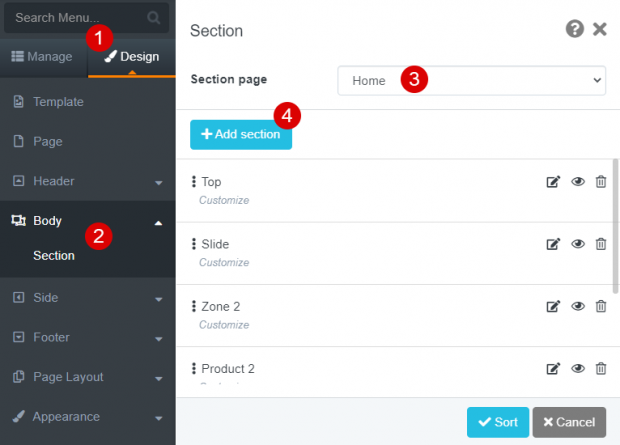 3. Untuk mengedit bagian klik ikon 1 (ikon pensil), untuk menyembunyikannya klik ikon 2 (ikon mata), dan untuk menghapus klik ikon 3 (ikon tempat sampah)