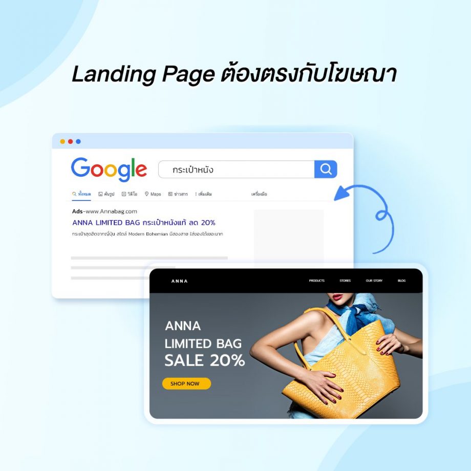 และข้อความโฆษณาระบุว่ากระเป๋าหนังลดราคา 20% ลูกค้าที่คลิกโฆษณาเข้ามาจะต้องเห็นสินค้า และสามารถสั่งซื้อกระเป๋าหนังด้วยโปรโมชั่นดังกล่าวได้ใน Landing Page