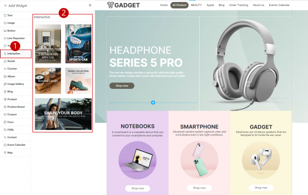 6. อินเทอร์แอคทีฟ (Interactive) สามารถสร้างวิดเจ็ตที่มีลูกเล่นของข้อความเคลื่อนไหวได้ ซึ่งวิธีการเพิ่มวิตเจ็ตอินเทอร์แอคทีฟมีดังนี้