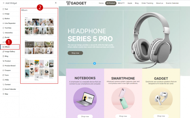 9. อัลบั้ม (Album) สามารถสร้างวิดเจ็ตอัลบั้ม ที่มีการลงข้อมูลฝั่งจัดการเว็บไซต์มาแสดงผลได้ และยังตั้งค่ารูปแบบการแสดงผลเลือกหมวดหมู่ ตกแต่งสีชื่ออัลบั้มได้ตามความต้องการ โดยวิธีการเพิ่มวิดเจ็ตอัลบั้มมีดังนี้