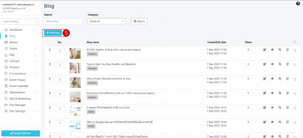 5. ระบบจะพามาที่ระบบหลังบ้านให้ไปที่เมนู “Blog” จากนั้นคลิกที่ปุ่ม  “เพิ่มเนื้อหา” (Add Blog)  โดยวิธีการเพิ่มเนื้อหา (Blog) สามารถดูได้ที่ การเพิ่มโพสต์ (Blog)
