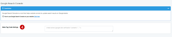 4.ติดตั้ง Code Meta Tag ที่เป็น Google Search Console คือบริการจาก Google ที่เป็นเครื่องมือสำหรับช่วยเหลือเจ้าของเว็บไซต์ เพื่อปรับปรุงให้เว็บไซต์ติดอันดับผลการค้นหาบน Google ได้ดียิ่งขึ้น (วิธีการนำโค้ด Google Search Console มาติดตั้งที่เว็บไซต์ คลิกที่นี่)
