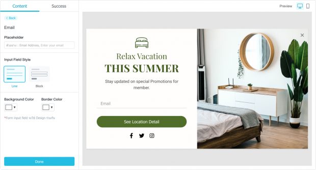 - กำหนด Action ของปุ่มได้ มี 2 รูปแบบ คือ กำหนดให้ปุ่มเป็นปุ่มที่กดเพื่อปิด Popup หรือ กำหนดให้ลิงก์ไปยังเพจอื่นของเว็บไซตืได้