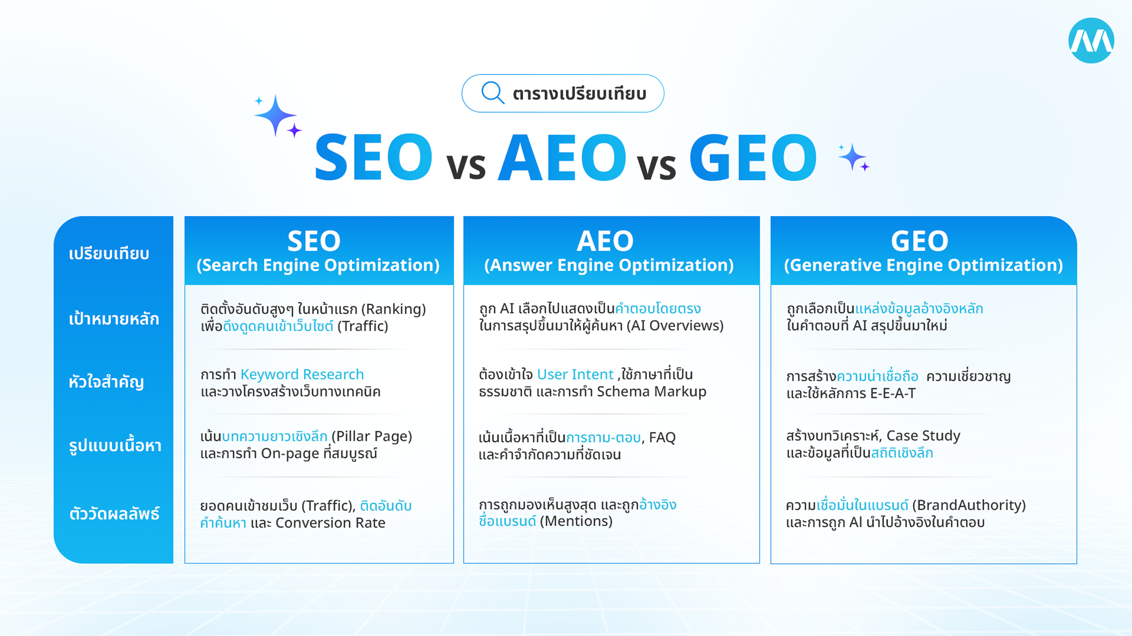 เจาะลึกความต่าง SEO AEO GEO เปรียบเทียบให้เห็นภาพชัด ๆ