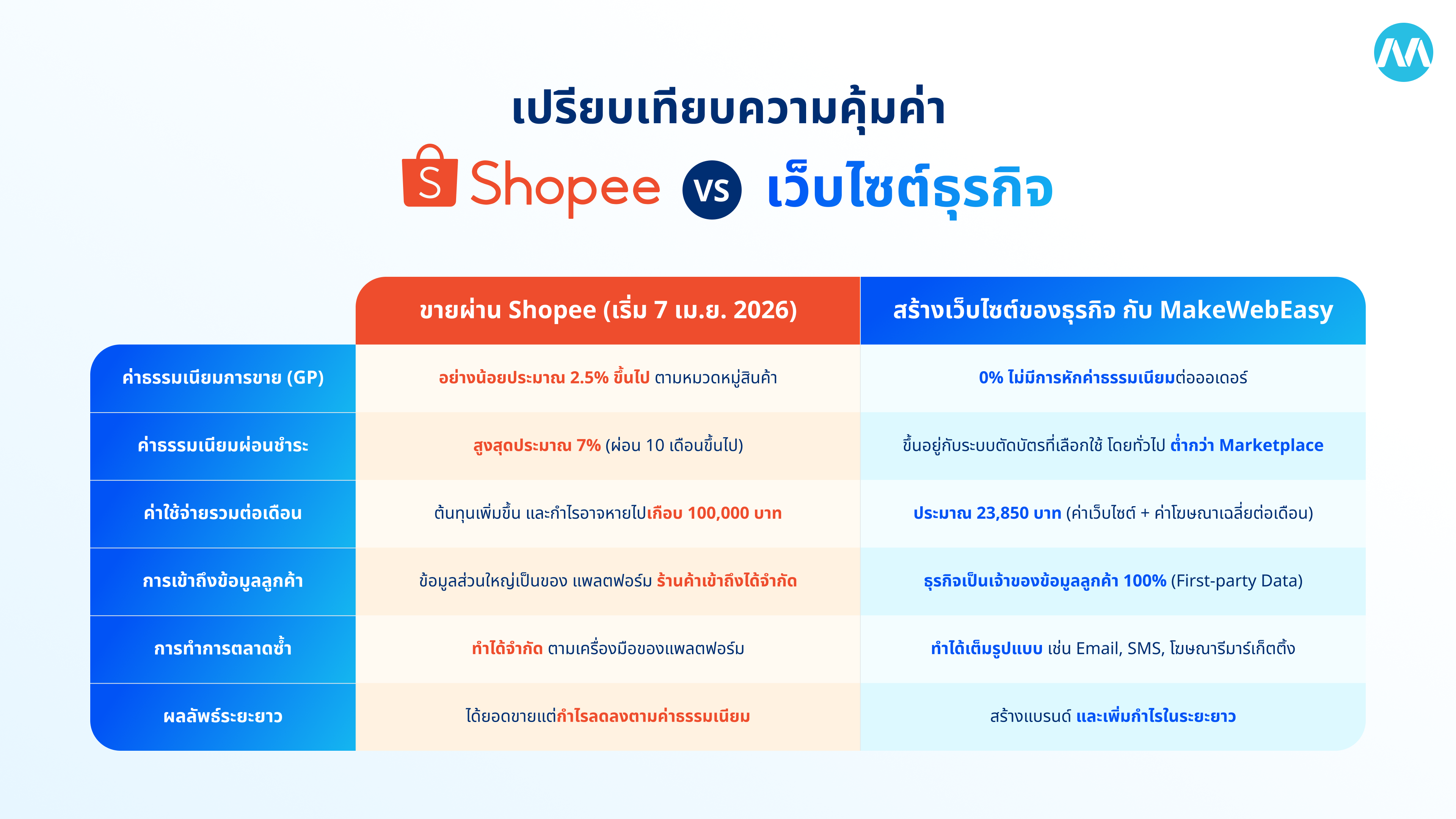 Shopee ยังเป็นช่องทางที่ดีในการหาลูกค้าใหม่ แต่หากคุณต้องการผลกำไรที่จับต้องได้ และความมั่นคงของแบรนด์ การมีเว็บไซต์ของตัวเองคือส่วนสำคัญในยุคการแข่งขันที่สูงแบบนี้ค่ะ