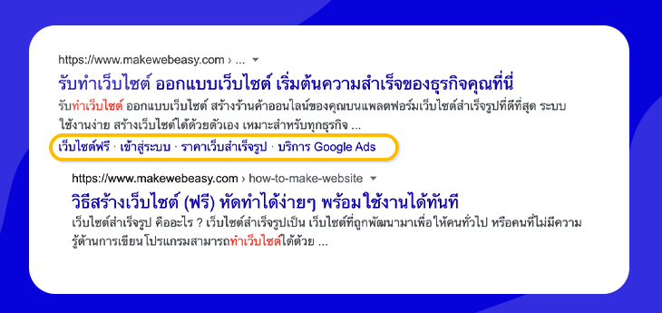 เชื่อว่าหลายคนที่เข้ามาอ่านบทความนี้ น่าจะเคยเสิร์ชหาข้อมูลบน Google แล้วเห็นว่าเว็บไซต์ที่ขึ้นมาแสดงบางครั้งมีเมนูต่างๆ (Sitelinks) เพิ่มขึ้นมาให้คลิกด้วย ดูโดดเด่นและมีความน่าสนใจ อยากจะมีบ้าง บทความนี้มีคำตอบสำหรับคุณ