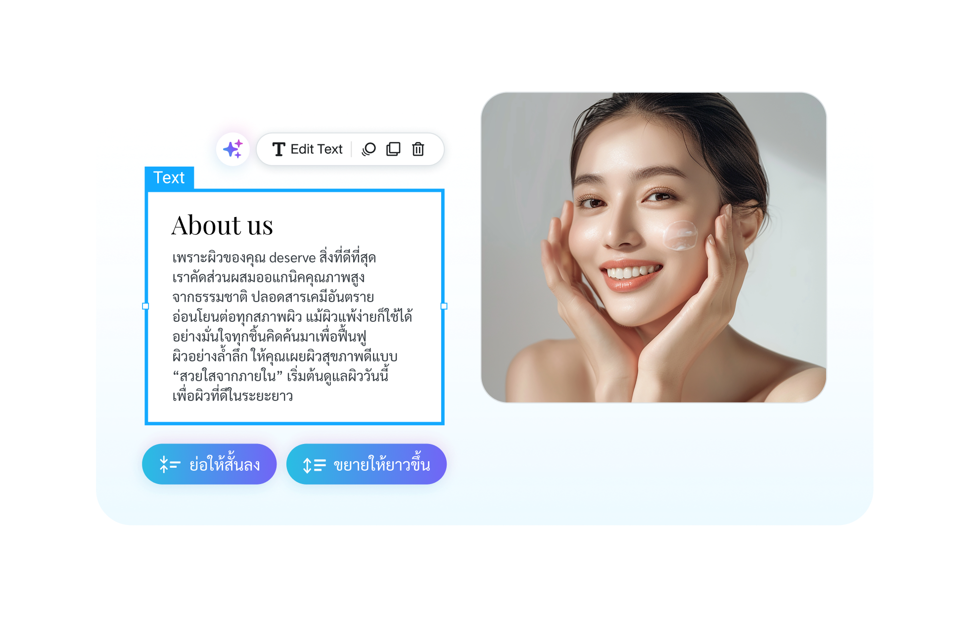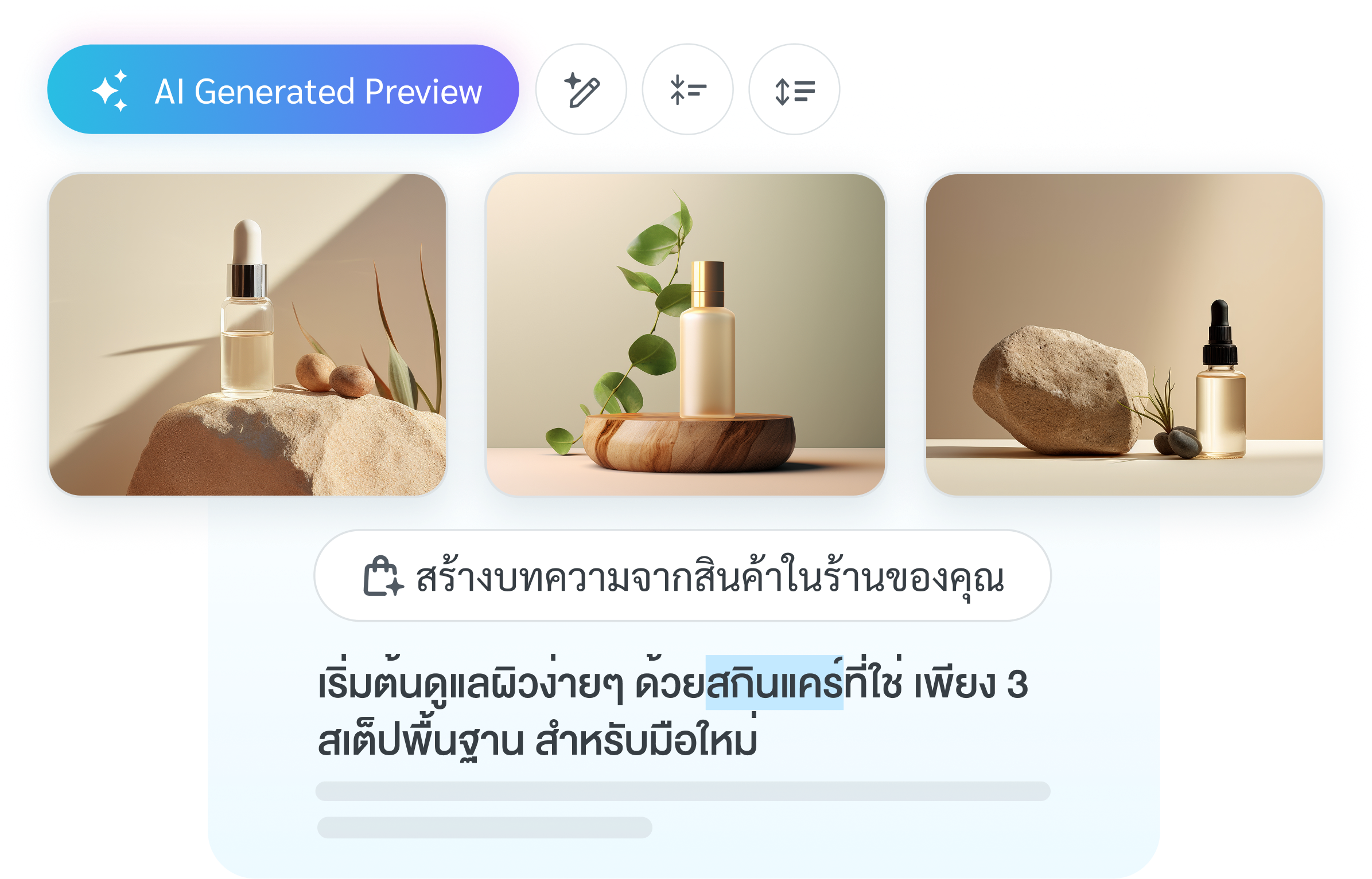 เปลี่ยนข้อมูลสินค้าธรรมดาให้กลายเป็นคอนเทนต์ที่เล่าเรื่องได้อย่างน่าสนใจ AI จะช่วยหยิบจุดเด่น ของสินค้าออกมาสื่อสารให้เข้าใจง่าย ตรงใจลูกค้า และช่วยกระตุ้นให้เกิดการตัดสินใจซื้อได้มากขึ้น