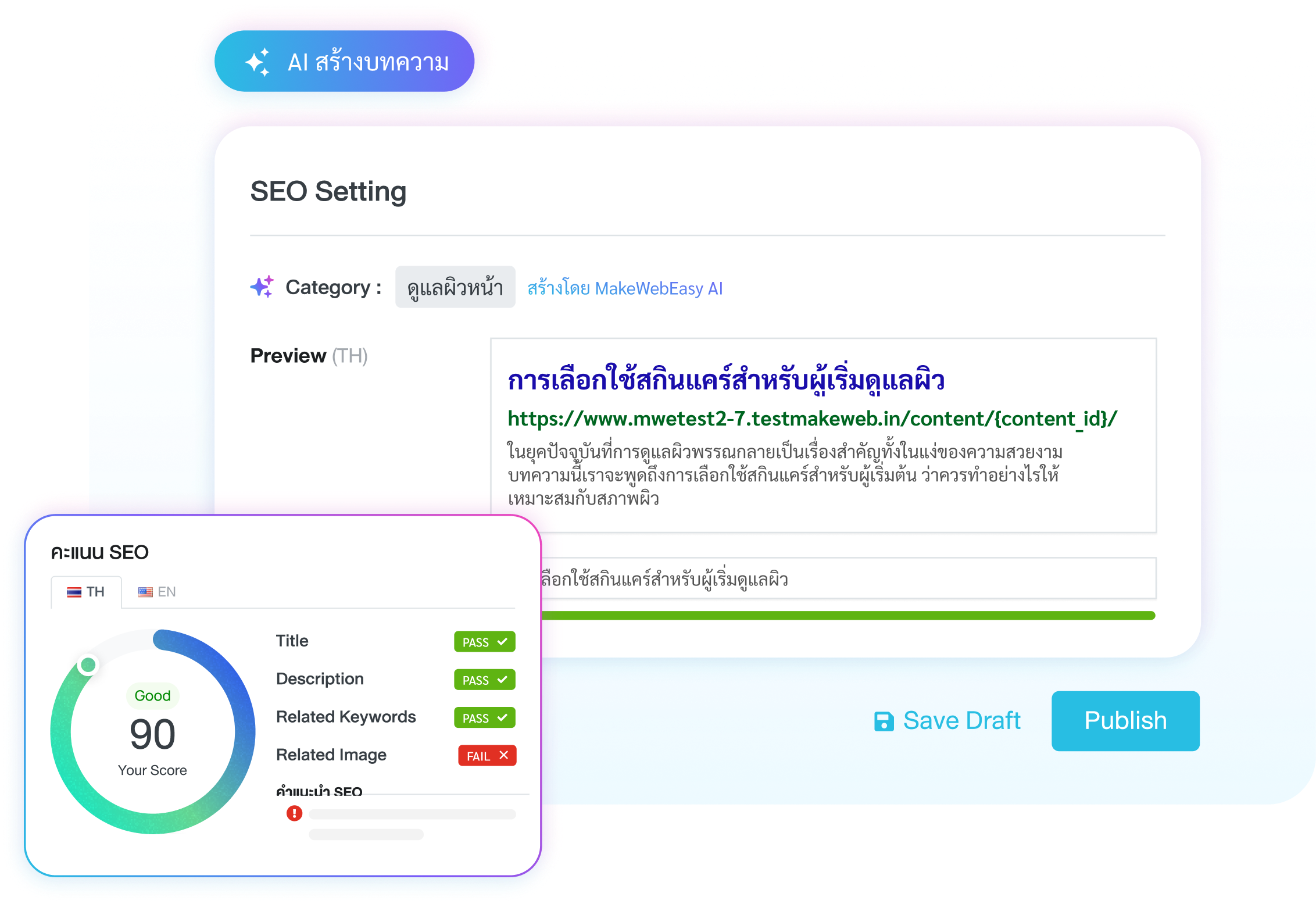 ระบบ AI ช่วยประเมินคะแนน SEO ตรวจสอบโครงสร้าง เนื้อหาและคีย์เวิร์ดให้โดยอัตโนมัติ เพื่อให้มั่นใจว่า ทุกคอนเทนต์ของคุณมีประสิทธิภาพสูงสุดและพร้อมติดอันดับการค้นหา