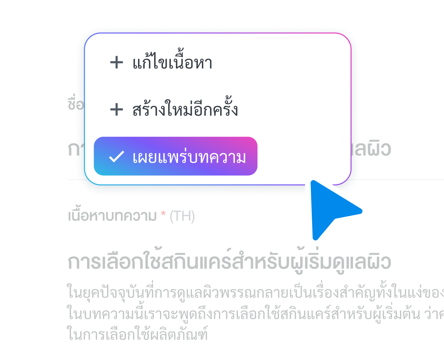 ให้ AI ช่วยคุณเขียนบทความ SEO คุณภาพ ถูกใจทั้งผู้อ่านและ Google ช่วยดึงกลุ่มเป้าหมายให้เข้า เว็บไซต์ได้อย่าง ต่อเนื่องเพิ่มโอกาสให้ธุรกิจของคุณ ถูกมองเห็น และค่อย ๆ เปลี่ยนผู้เข้าชมให้กลายเป็นลูกค้า